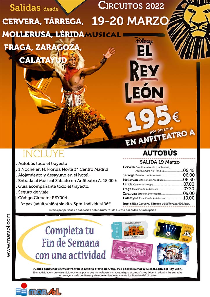 Hotel (1 noche) + bus + Entrada musical Rey León el 19 de Marzo 2022