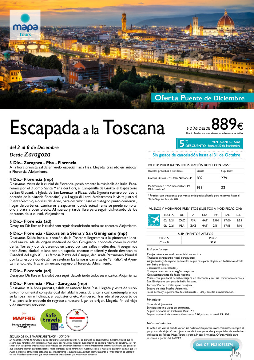 OFERTA ESCAPADA A LA TOSCANA PUENTE DE LA CONSTITUCIÓN. SALIDA DESDE ZARAGOZA