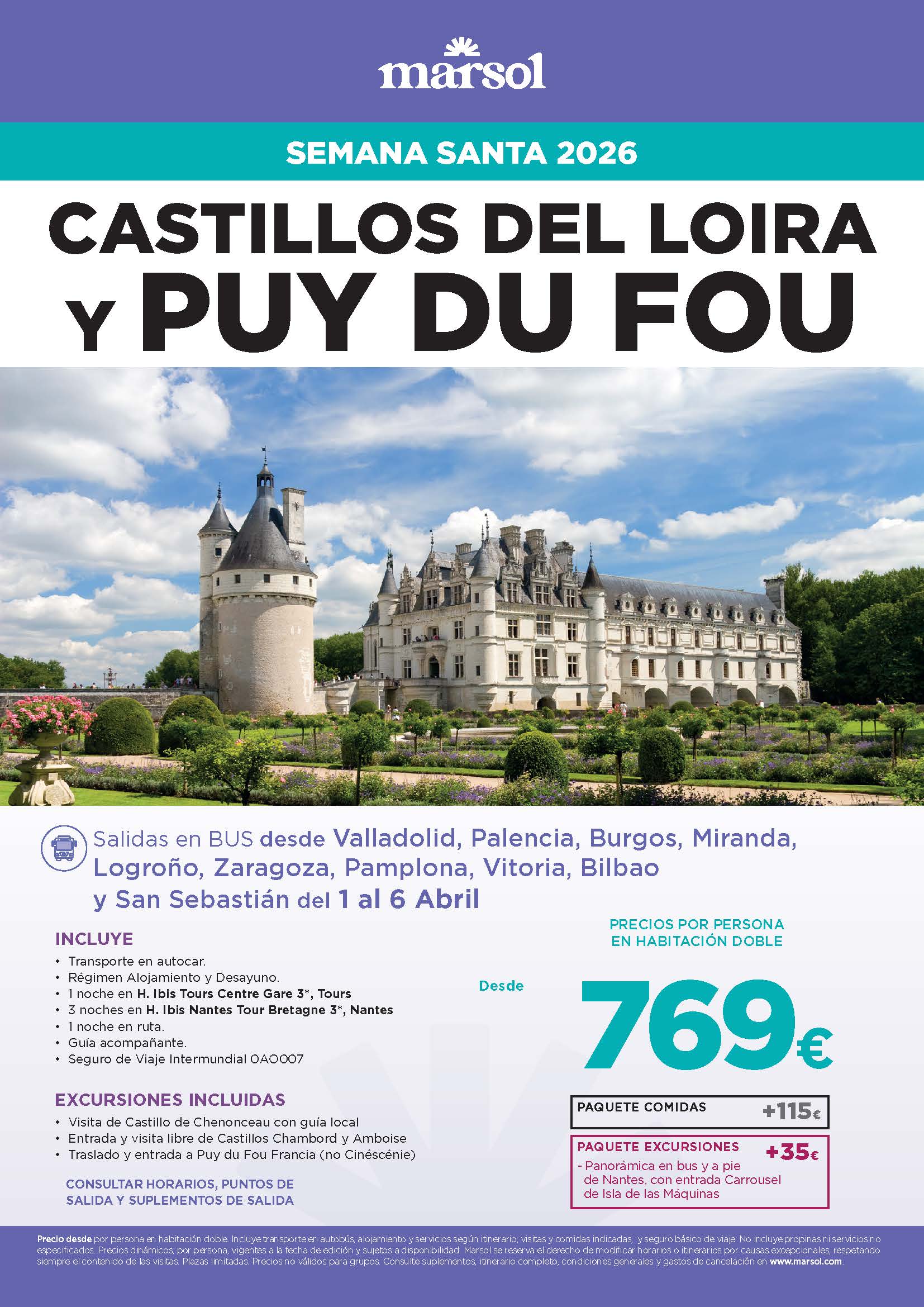 OFERTA SEMANA SANTA CASTILLOS DEL LOIRA Y PUY DU FOU EN BUS DESDE ZARAGOZA